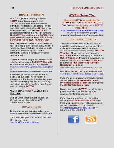 www.burnsurvivorsttw.org/donations/donations.html Next fill out the BSTTW Volunteer E-Form at: